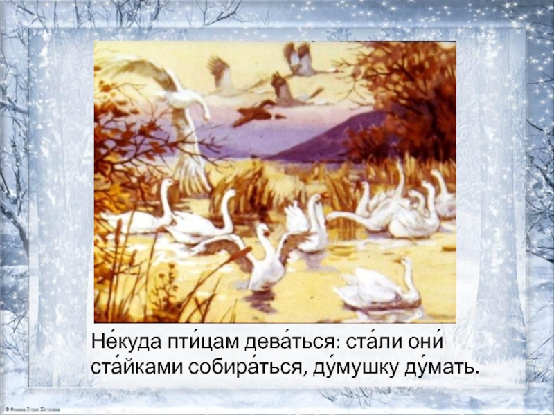 Слайд 6Не́куда пти́цам дева́ться: ста́ли они́ ста́йками собира́ться, ду́мушку ду́мать.