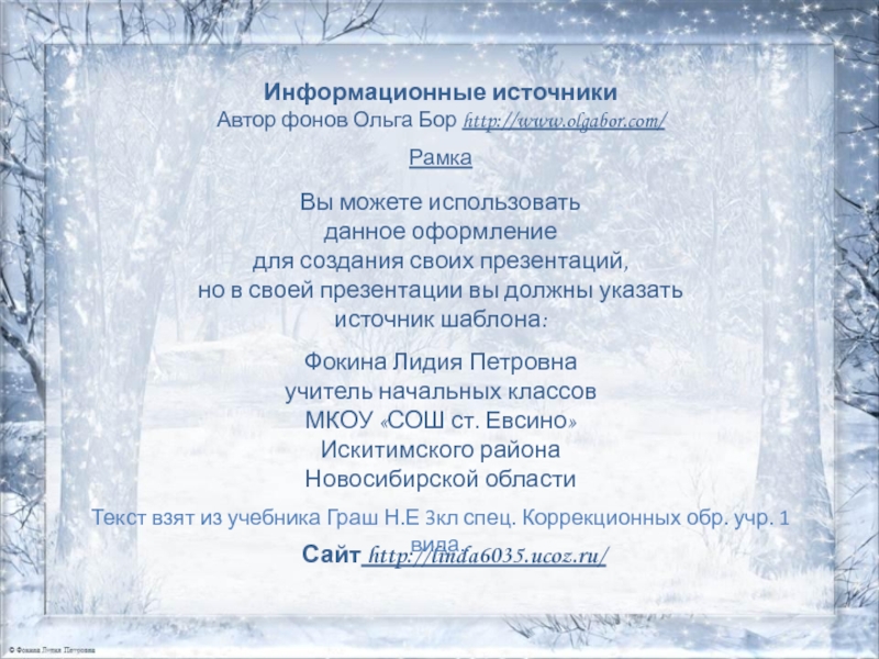 Информационные источникиАвтор фонов Ольга Бор http://www.olgabor.com/Рамка Текст взят из учебника Граш Н.Е 3кл спец. Коррекционных обр. учр.