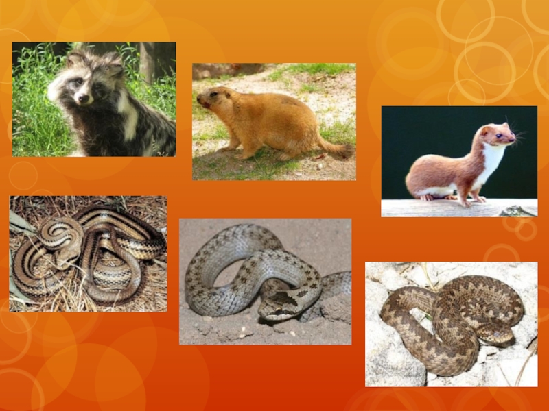полёвка, мыши, хорёк, ласка, ящерица, полоз, медянка, уж, гадюка степная, жабы, лягушки и т.д.
