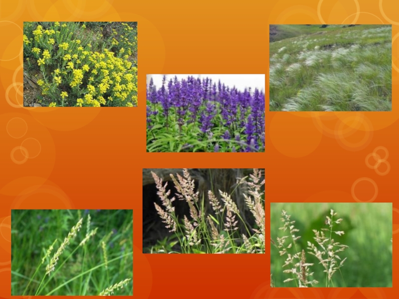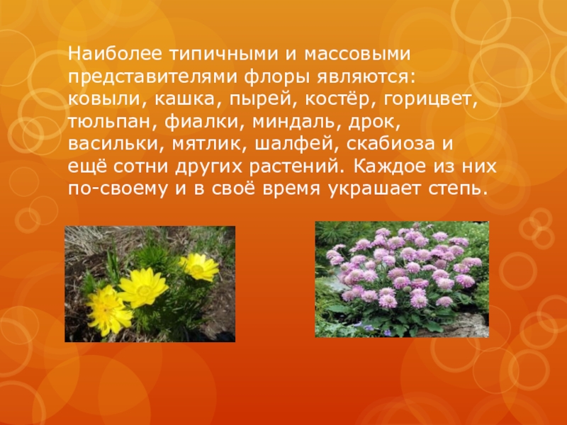 Слайд 5Наиболее типичными и массовыми представителями флоры являются: ковыли, кашка, пырей, костёр,