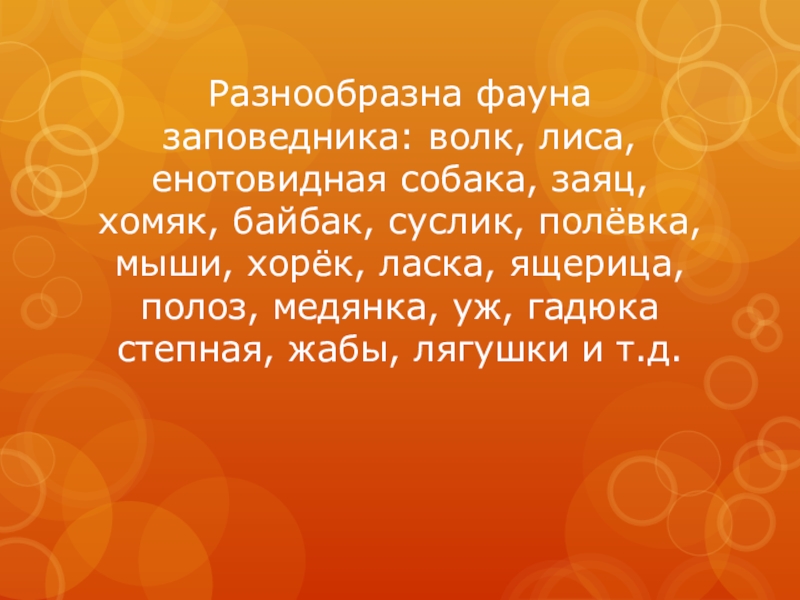 Слайд 7Разнообразна фауна заповедника: волк, лиса, енотовидная собака, заяц, хомяк, байбак, суслик,