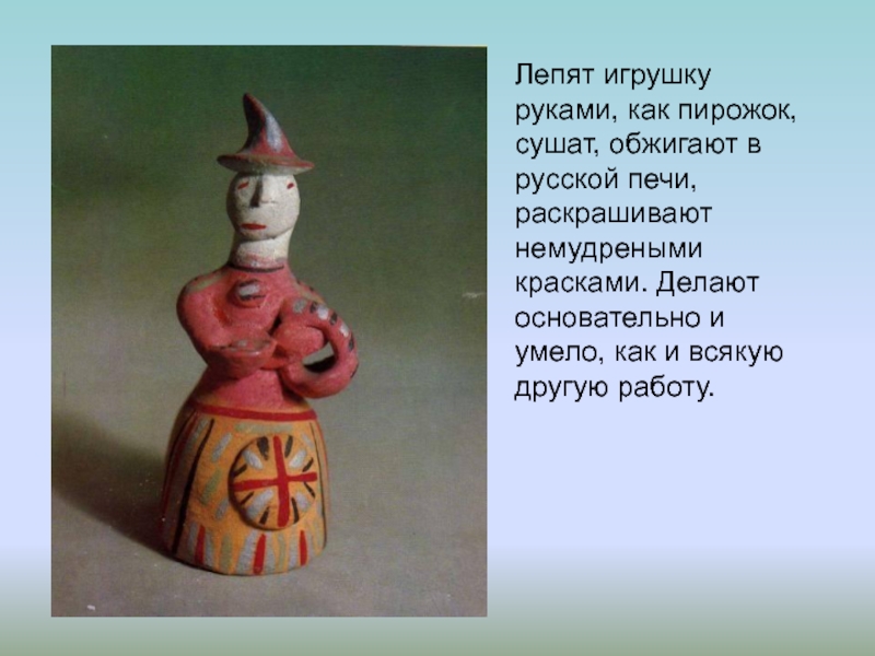 Слайд 26Лепят игрушку руками, как пирожок, сушат, обжигают в русской печи, раскрашивают