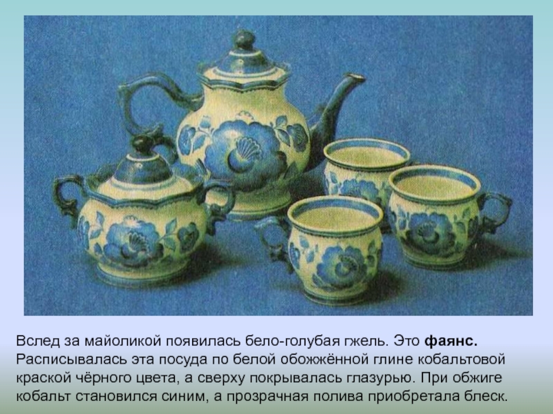 Слайд 40Вслед за майоликой появилась бело-голубая гжель. Это фаянс. Расписывалась эта посуда