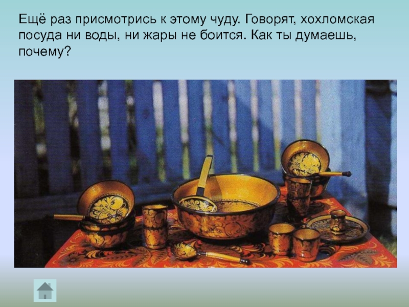 Слайд 23Ещё раз присмотрись к этому чуду. Говорят, хохломская посуда ни воды,