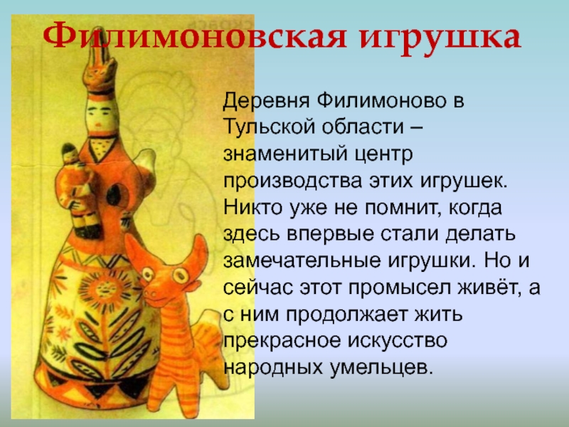 Слайд 51Деревня Филимоново в Тульской области – знаменитый центр производства этих игрушек.