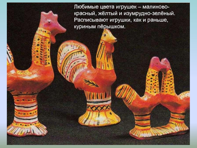 Слайд 53Любимые цвета игрушек – малиново-красный, жёлтый и изумрудно-зелёный. Расписывают игрушки, как