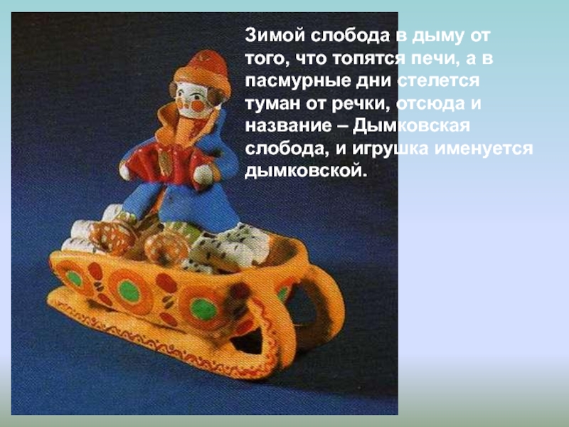 пасмурные дни стелется туман от речки, отсюда и название – Дымковская слобода, и игрушка именуется дымковской.