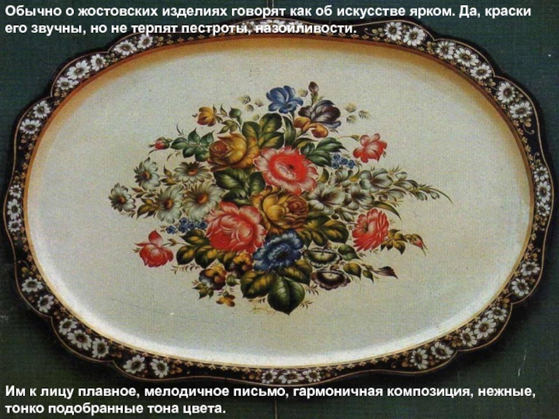 Слайд 47Обычно о жостовских изделиях говорят как об искусстве ярком. Да, краски