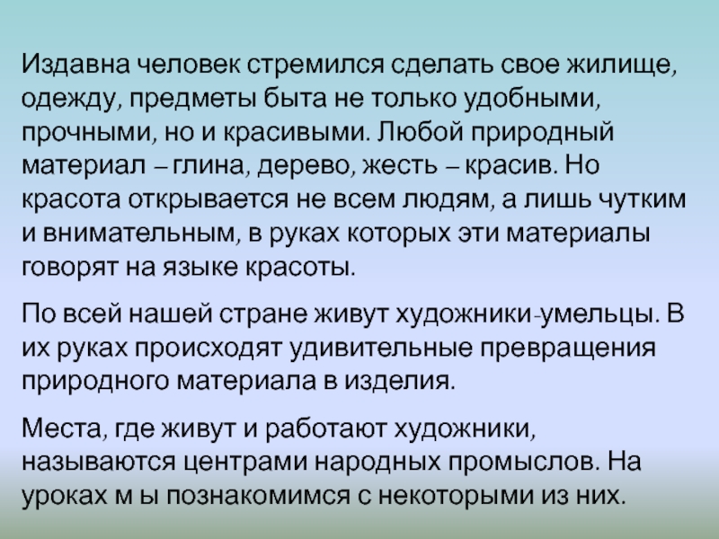 Места, где живут и работают художники, называются центрами народных промыслов. На уроках м ы познакомимся с некоторыми из них.