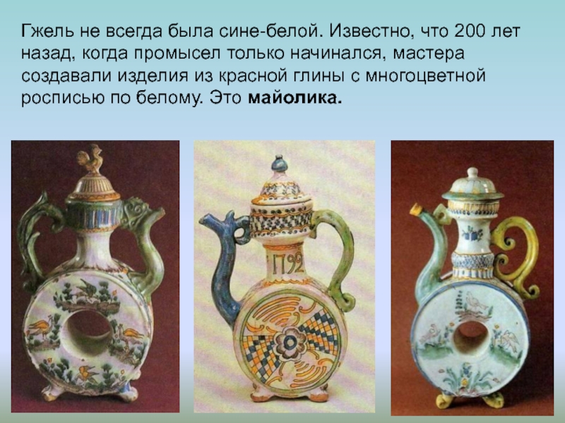 промысел только начинался, мастера создавали изделия из красной глины с многоцветной росписью по белому. Это майолика.