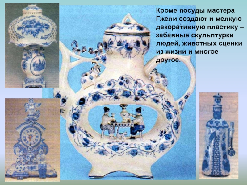 Слайд 41Кроме посуды мастера Гжели создают и мелкую декоративную пластику – забавные