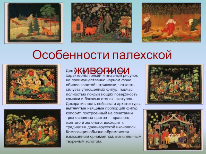 черном фоне, обилие золотой штриховки, четкость силуэта уплощенных фигур, подчас полностью покрывающих поверхность крышки и боковых стенок шкатулок. Декоративность пейзажа и архитектуры, вытянутые изящные пропорции фигур, колорит, построенный на сочетании трех основных цветов — красного, желтого и зеленого, восходят к традициям древнерусской иконописи. Композиция обычно обрамляется изысканным орнаментом, выполненным твореным золотом.