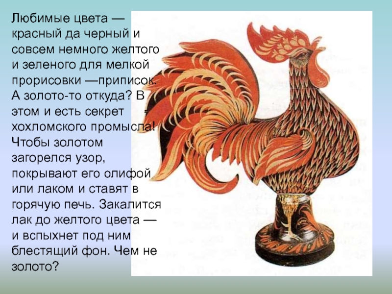 зеленого для мелкой прорисовки —приписок. А золото-то откуда? В этом и есть секрет хохломского промысла! Чтобы золотом загорелся узор, покрывают его олифой или лаком и ставят в горячую печь. Закалится лак до желтого цвета — и вспыхнет под ним блестящий фон. Чем не золото?