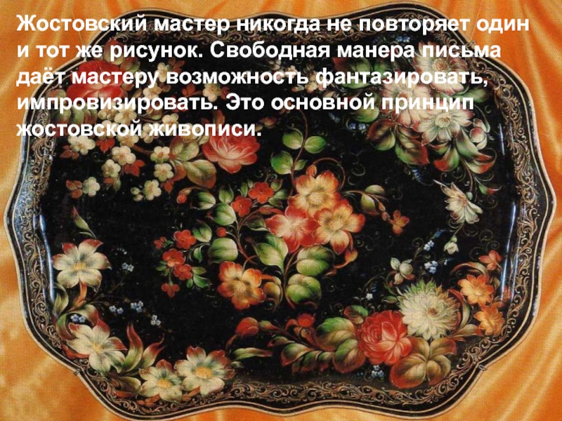 манера письма даёт мастеру возможность фантазировать, импровизировать. Это основной принцип жостовской живописи.