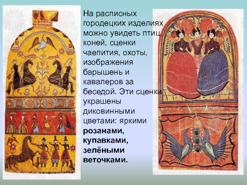 Слайд 56На расписных городецких изделиях можно увидеть птиц, коней, сценки чаепития, охоты,