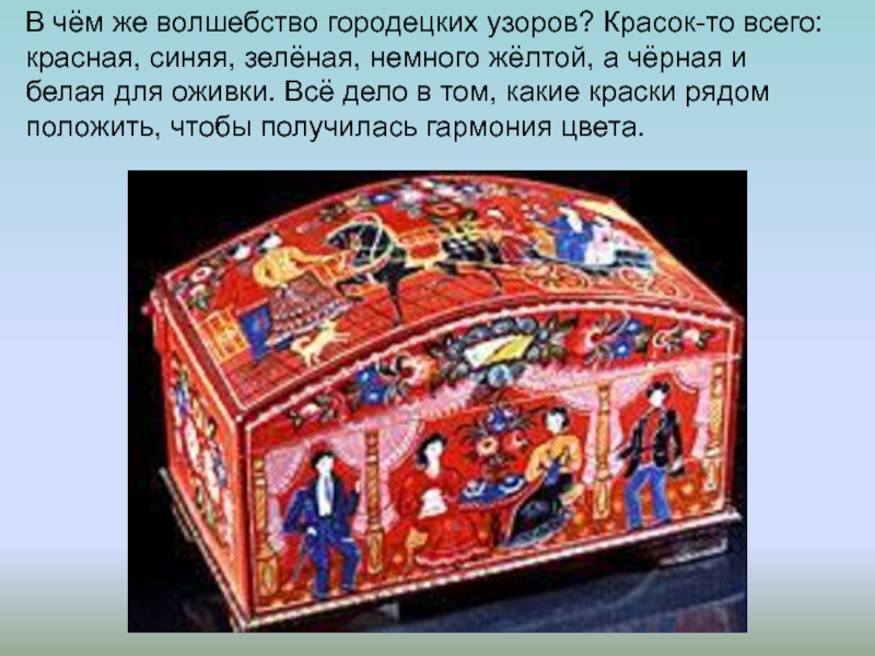 Слайд 58В чём же волшебство городецких узоров? Красок-то всего: красная, синяя, зелёная,