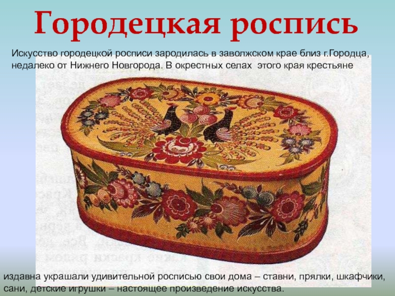 Слайд 55Искусство городецкой росписи зародилась в заволжском крае близ г.Городца, недалеко от