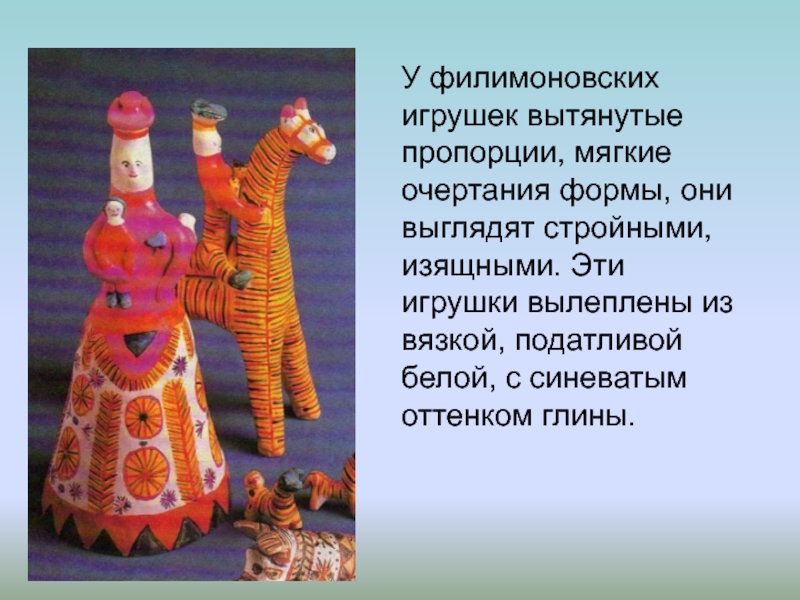 Слайд 52У филимоновских игрушек вытянутые пропорции, мягкие очертания формы, они выглядят стройными,
