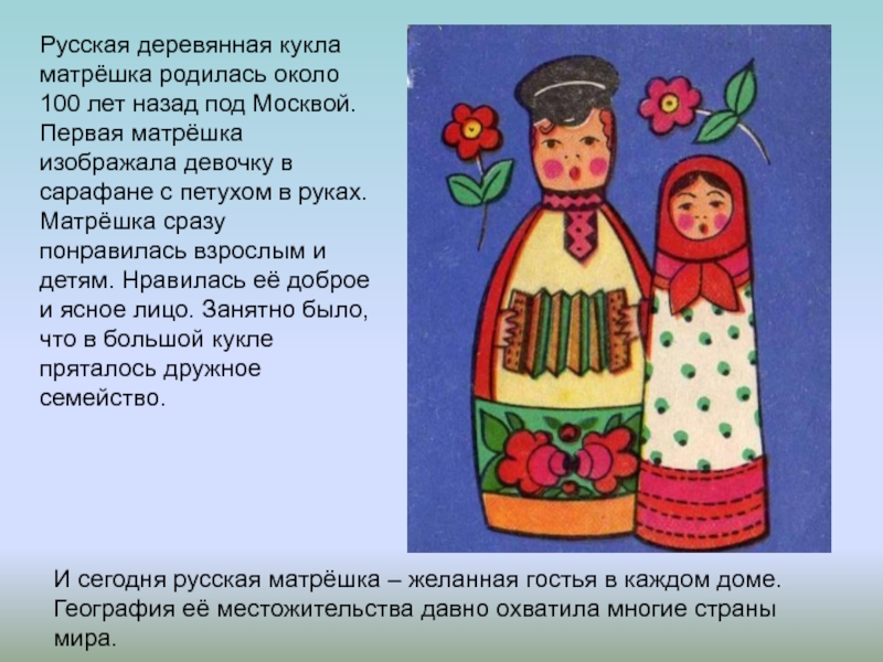 И сегодня русская матрёшка – желанная гостья в каждом доме. География её местожительства давно охватила многие страны мира.