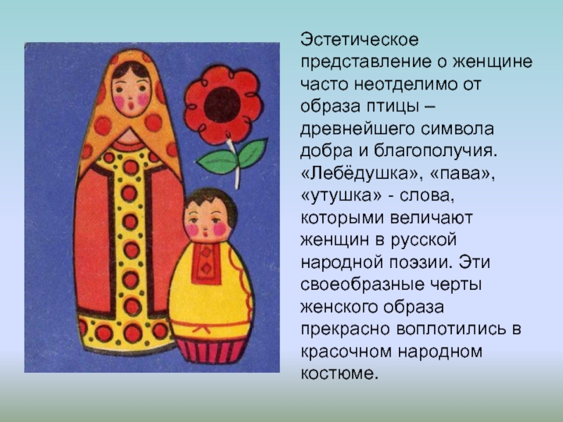 символа добра и благополучия. «Лебёдушка», «пава», «утушка» - слова, которыми величают женщин в русской народной поэзии. Эти своеобразные черты женского образа прекрасно воплотились в красочном народном костюме.