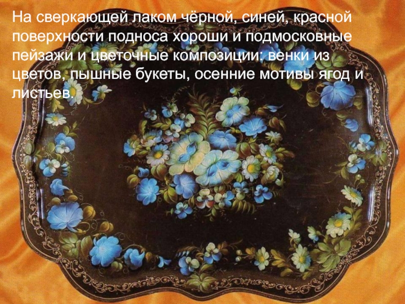 Слайд 45На сверкающей лаком чёрной, синей, красной поверхности подноса хороши и подмосковные