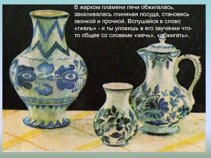 прочной. Вслушайся в слово «гжель» - и ты уловишь в его звучании что-то общее со словами «жечь», «обжигать».