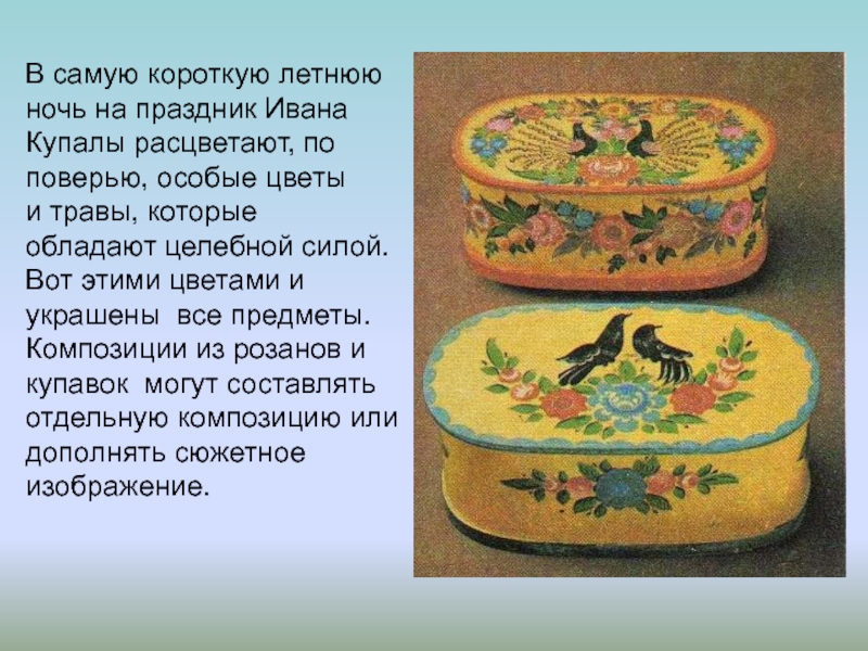 поверью, особые цветы и травы, которые обладают целебной силой. Вот этими цветами и украшены все предметы. Композиции из розанов и купавок могут составлять отдельную композицию или дополнять сюжетное изображение.