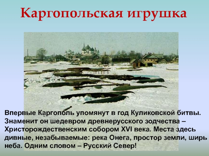 Слайд 24Впервые Каргополь упомянут в год Куликовской битвы. Знаменит он шедевром древнерусского
