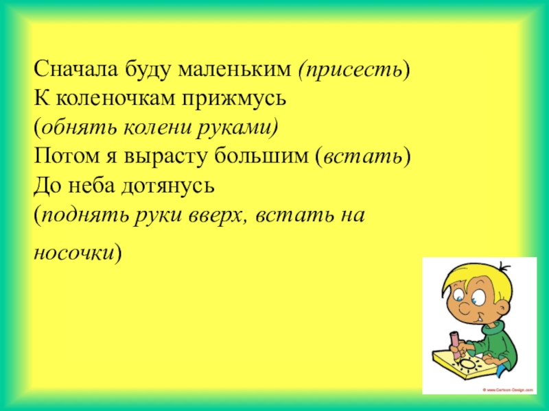 Сначала буду маленьким (присесть)К коленочкам прижмусь(обнять колени руками)Потом я вырасту большим (встать)До неба дотянусь(поднять руки вверх,