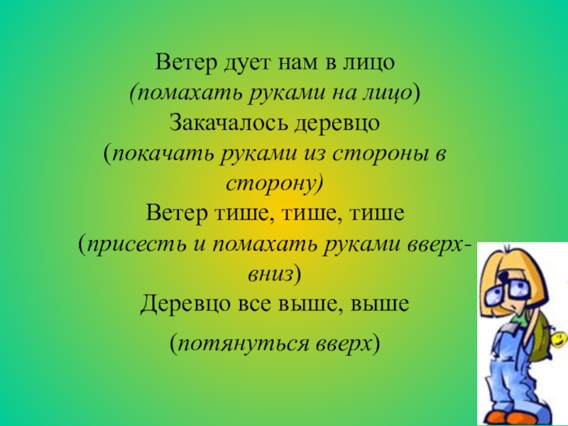 Ветер дует нам в лицо(помахать руками на лицо)Закачалось деревцо(покачать руками из стороны в сторону)Ветер тише, тише,