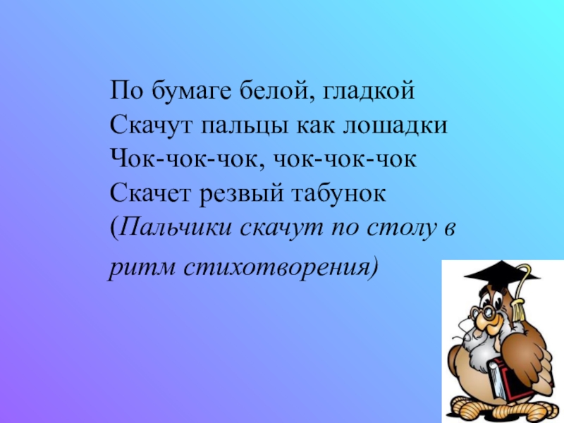 По бумаге белой, гладкойСкачут пальцы как лошадкиЧок-чок-чок, чок-чок-чокСкачет резвый табунок(Пальчики скачут по столу в ритм стихотворения)
