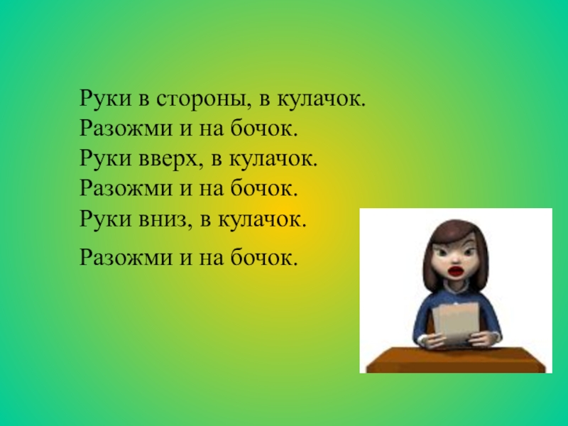 Руки в стороны, в кулачок.Разожми и на бочок.Руки вверх, в кулачок.Разожми и на бочок.Руки вниз, в