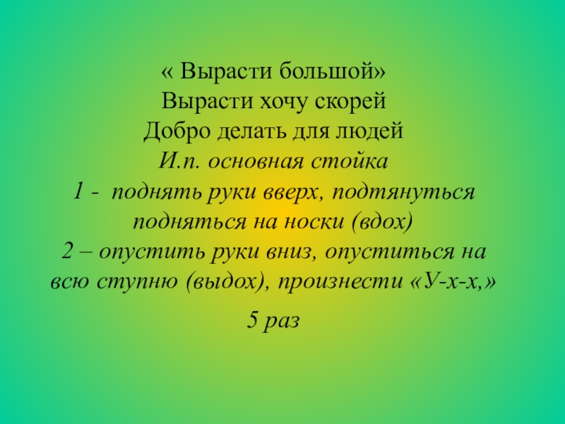 « Вырасти большой»Вырасти хочу скорейДобро делать для людейИ.п. основная стойка1