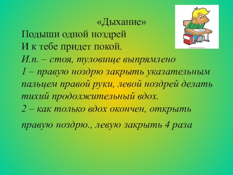«Дыхание»Подыши одной ноздрейИ к тебе придет покой.И.п. – стоя, туловище выпрямлено1 – правую ноздрю закрыть указательным