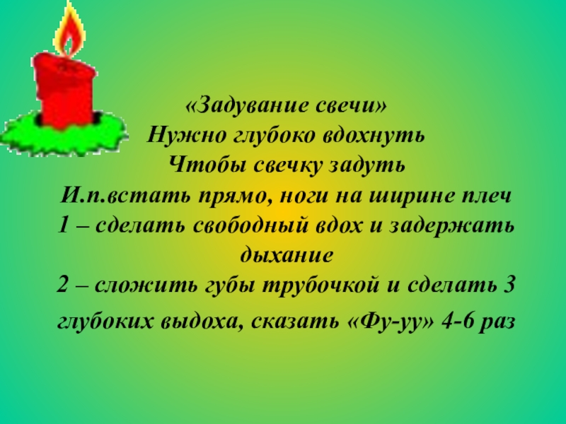 Слайд 3«Задувание свечи» Нужно глубоко вдохнуть Чтобы свечку задуть И.п.встать прямо, ноги на ширине плеч 1