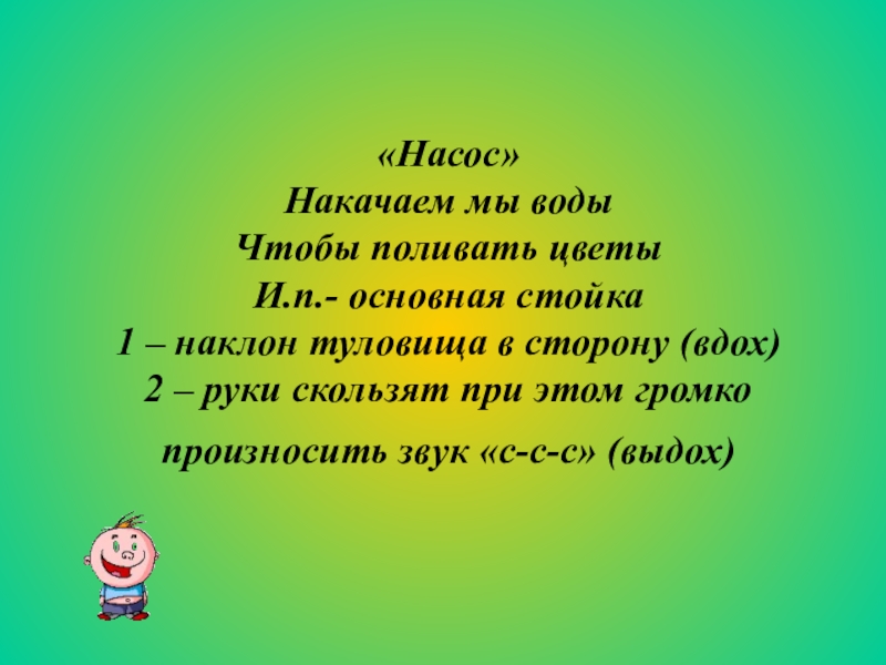 «Насос» Накачаем мы воды Чтобы поливать цветы И.п.- основная стойка 1 – наклон туловища в сторону (вдох) 2 – руки скользят при этом громко произносить звук «с-с-с» (выдох)