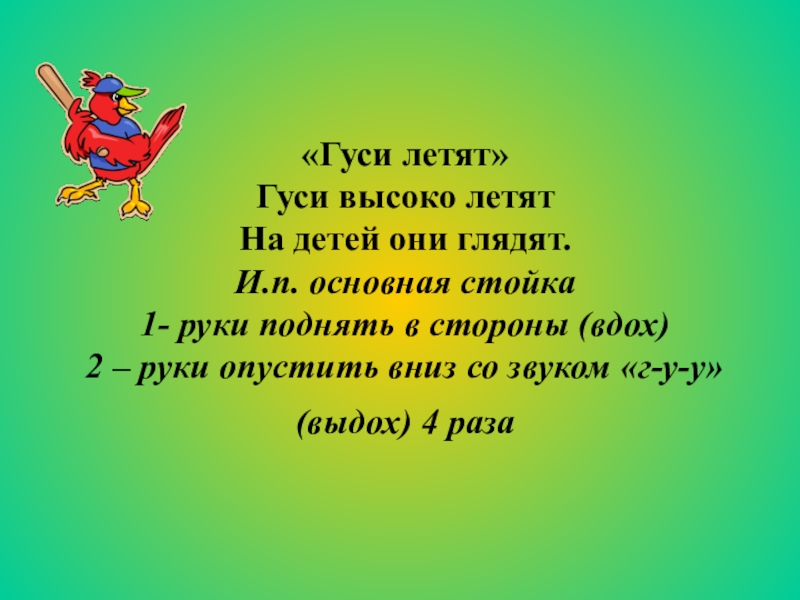 Слайд 4 «Гуси летят» Гуси высоко летят На детей они глядят. И.п. основная стойка 1- руки поднять