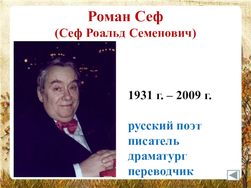 Роман Сеф  (Сеф Роальд Семенович)1931 г. – 2009 г.русский поэт писательдраматург переводчик