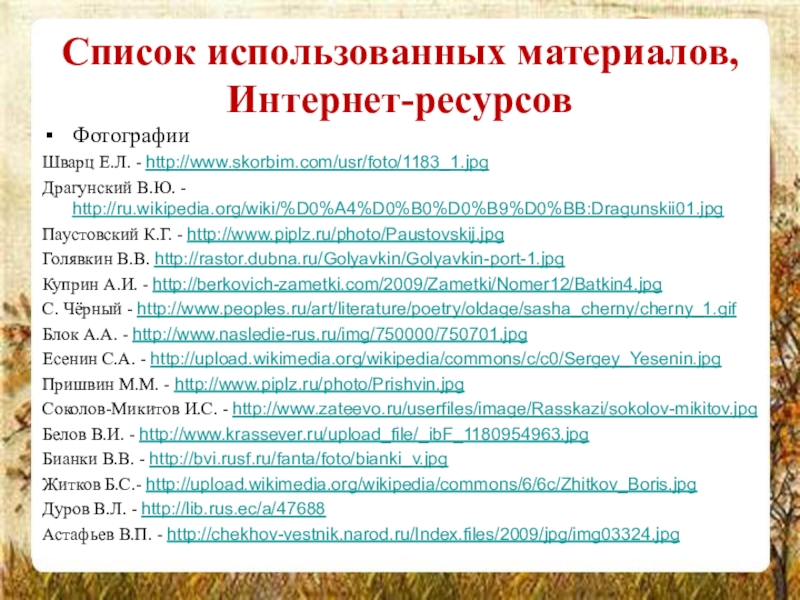 Список использованных материалов,  Интернет-ресурсовФотографииШварц Е.Л. - http://www.skorbim.com/usr/foto/1183_1.jpgДрагунский В.Ю. - http://ru.wikipedia.org/wiki/%D0%A4%D0%B0%D0%B9%D0%BB:Dragunskii01.jpgПаустовский К.Г. - http://www.piplz.ru/photo/Paustovskij.jpgГолявкин В.В. http://rastor.dubna.ru/Golyavkin/Golyavkin-port-1.jpgКуприн А.И.