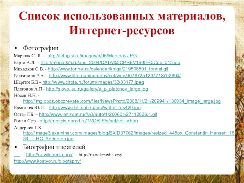 Список использованных материалов,  Интернет-ресурсовФотографииМаршак С. Я. – http://letopisi.ru/images/d/d6/Marshak.JPGБарто А.Л. - http://mega.km.ru/bes_2004/DATA%5CPREV1998%5Cpb_015.jpgМихалков С.В. - http://www.tonnel.ru/calendar/kniga/219508501_tonnel.gifБлагинина Е.А. -