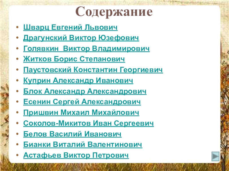 СодержаниеШварц Евгений ЛьвовичДрагунский Виктор ЮзефовичГолявкин Виктор ВладимировичЖитков Борис СтепановичПаустовский Константин ГеоргиевичКуприн Александр ИвановичБлок Александр АлександровичЕсенин Сергей АлександровичПришвин Михаил МихайловичСоколов-Микитов Иван СергеевичБелов Василий ИвановичБианки Виталий ВалентиновичАстафьев Виктор Петрович