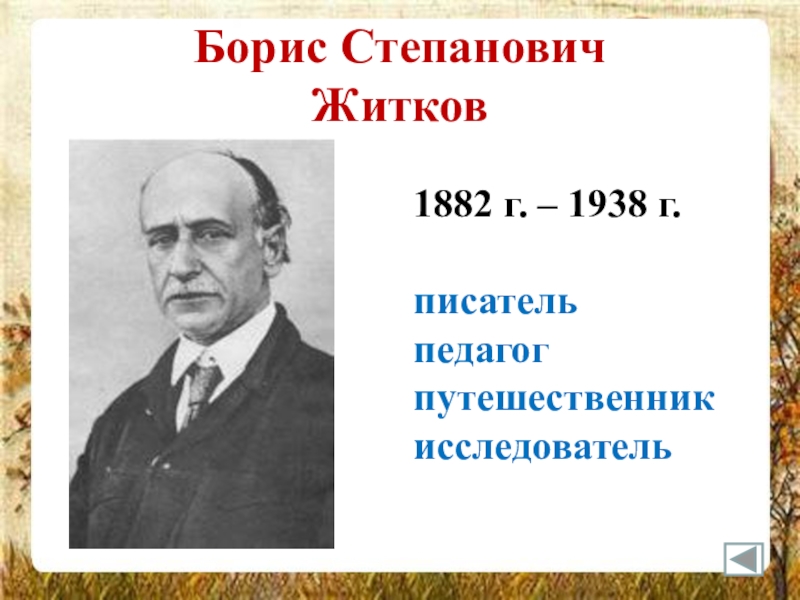 Борис Степанович Житков1882 г. – 1938 г.писательпедагогпутешественникисследователь