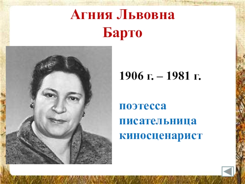 Агния Львовна  Барто1906 г. – 1981 г.поэтесса писательницакиносценарист