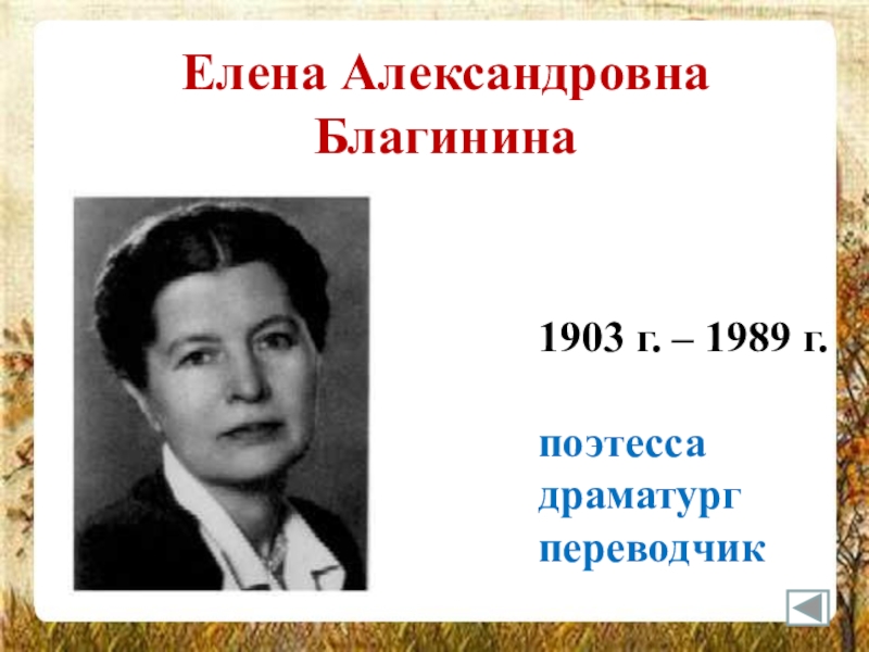 Елена Александровна Благинина1903 г. – 1989 г.поэтессадраматургпереводчик