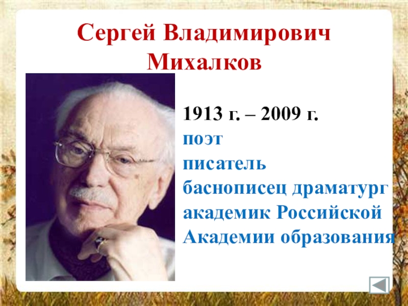 Сергей Владимирович  Михалков1913 г. – 2009 г.поэтписательбаснописец драматург академик Российской Академии образования