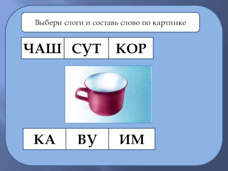 ЧАШСУТКОРКАВУИМВыбери слоги и составь слово по картинке