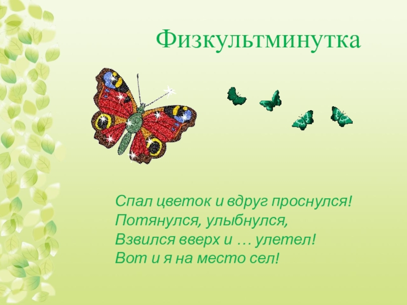 Физкультминутка Спал цветок и вдруг проснулся!Потянулся, улыбнулся,Взвился вверх и … улетел!Вот и я на место сел!