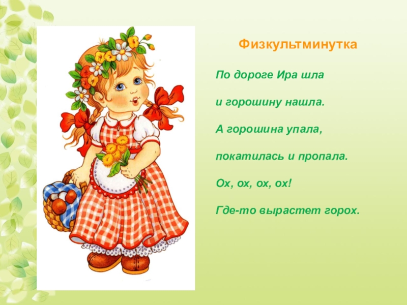 ФизкультминуткаПо дороге Ира шла и горошину нашла. А горошина упала,покатилась и пропала.Ох, ох, ох, ох!Где-то вырастет горох.