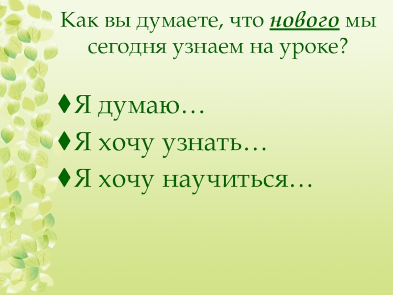 Как вы думаете, что нового мы сегодня узнаем на уроке?Я думаю…Я хочу узнать…Я хочу научиться…