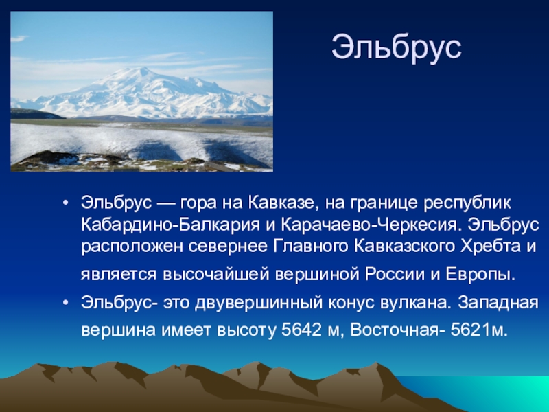 Эльбрус — гора на Кавказе, на границе республик Кабардино-Балкария и Карачаево-Черкесия.